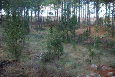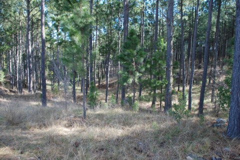 Con un frondoso bosque de pinos, suelo de tierra y rocas, con muchas ondulaciones, y afloramiento de rocas. Muy pintoresco.