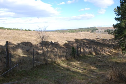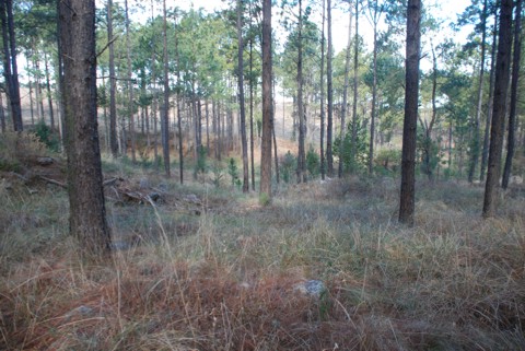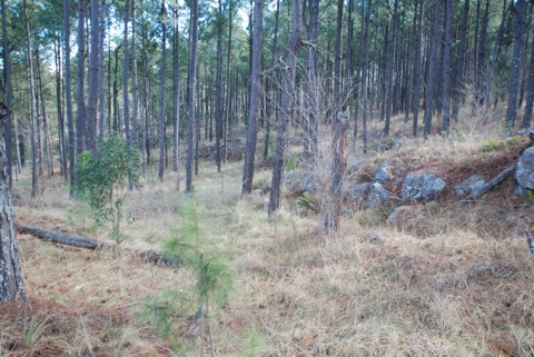 Con un frondoso bosque de pinos, con suelo de tierra y rocas, con ondulaciones y afloramiento de rocas, con vistas al este y sur.