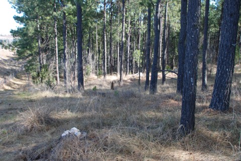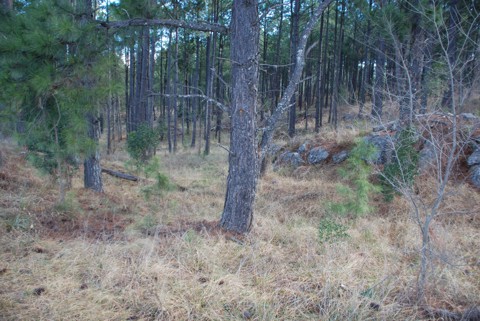 Con un frondoso bosque de pinos, con suelo de tierra y rocas, con ondulaciones y afloramiento de rocas, con vistas al este y sur.